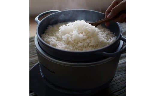 5合炊きの「ライスポット」です。ご飯が美味しく炊けるほか、低温調理や無水調理、炒め調理や発酵もお手のもの。鋳物ホーロー製の鍋と専用ヒーターの組み合わせで、誰でも簡単にプロ級の料理ができます。