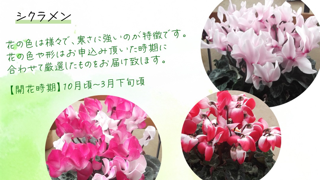 - シクラメン【 おまかせ 1点 】 ガーデニング 花 はな フラワー 鉢 鉢植え 常温 ギフト プレゼント 贈り物 贈答 牛久市 確実園 [BG009us]
