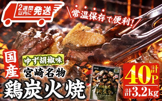 <1週間以内発送!> 宮崎名物 国産 鶏 炭火焼き ゆず胡椒味(計3.2kg・80g×40P) レンジアップ 小分け レトルト 柚子胡椒 惣菜 簡単調理 鶏肉 常温 常温保存 おつまみ おかず ご当地【AP-99】【株式会社 日向屋】