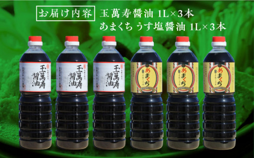 - 玉萬寿醤油・あまくちうす塩醤油 6本 セット 大容量 醤油 うす塩 健康 濃口 和食 醤油 しょう油 しょうゆ お醤油 セット 詰め合わせ 調味料 大豆 発酵食品 刺身 煮物 だし だし醤油 出汁醤油 出汁 濃口 濃い口 こいくち 安心 安全 手作り コク 旨味 国産 料理 グルメ 保存 リピート ギフト 人気 広島県産 江田島市/濱口醤油[XAA055]