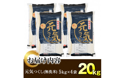 - <先行予約受付中!2025年11月中旬から順次発送予定><令和7年産>福岡県産ブランド米「元気つくし」無洗米(計20kg・5kg×4袋) お米 20キロ ごはん ご飯【ksg0381】【朝ごはん本舗】