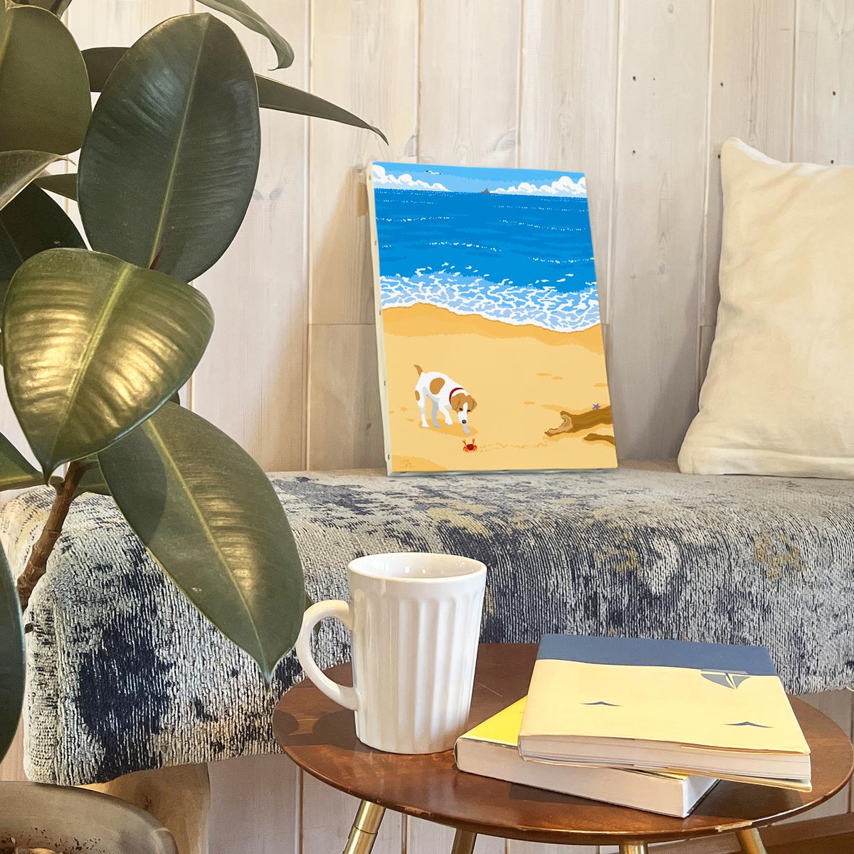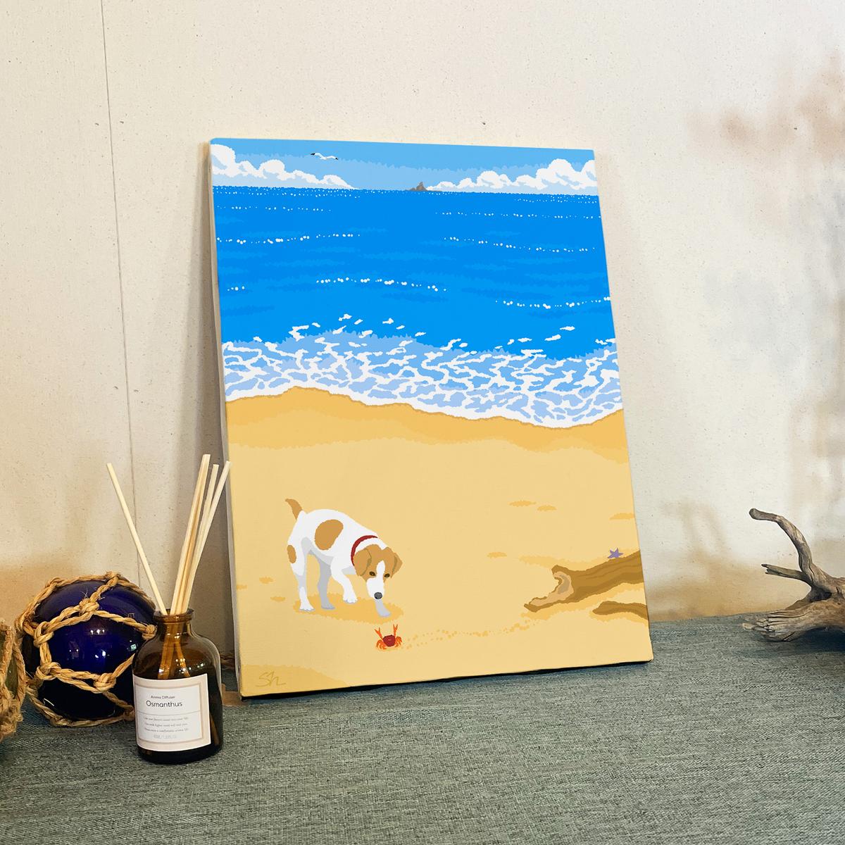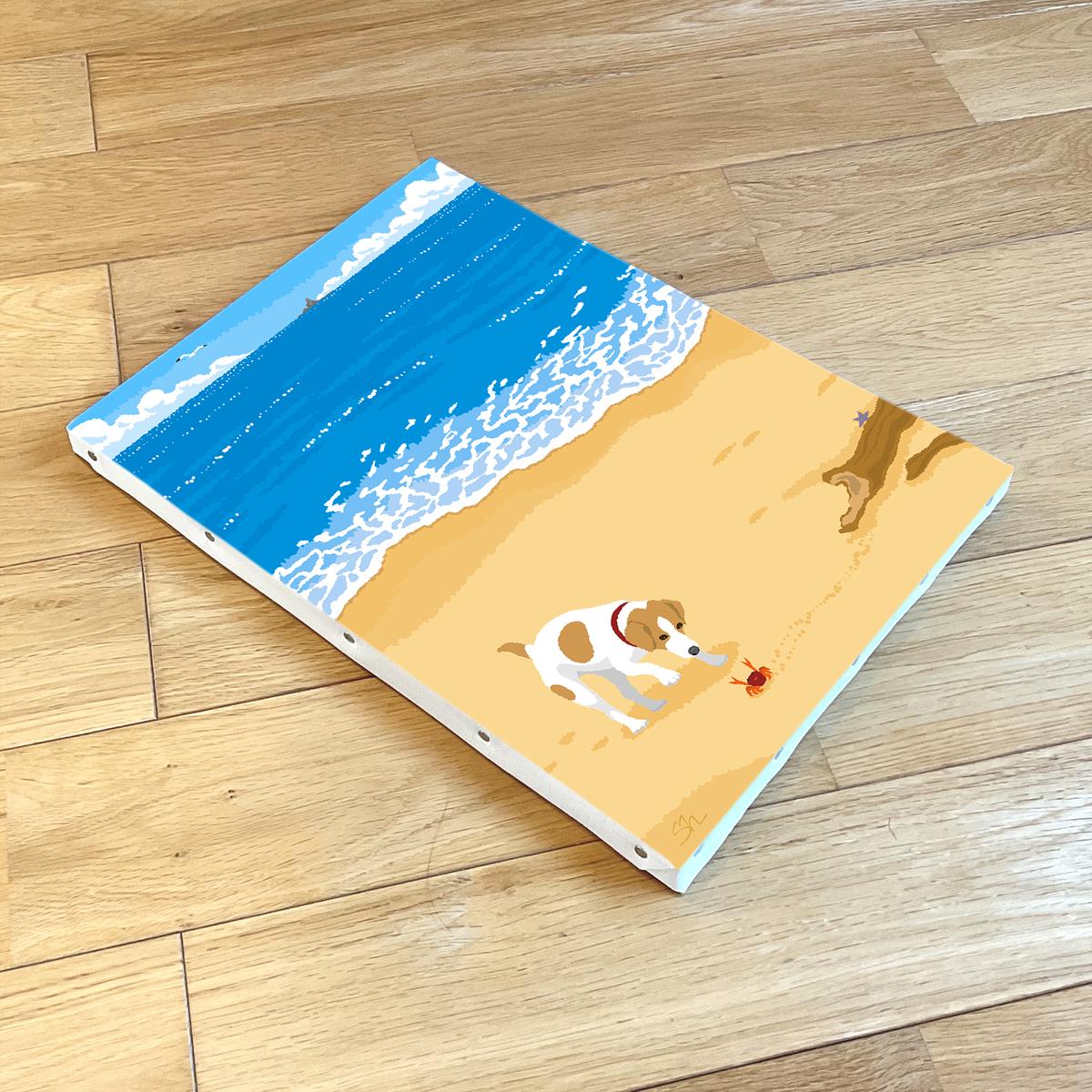 湘南・茅ヶ崎で描く、海を感じるイラストアート 『 湘南ランドスケープ04:渚の遭遇 』 キャンバスアートパネル(中) /絵画 風景 犬 猫