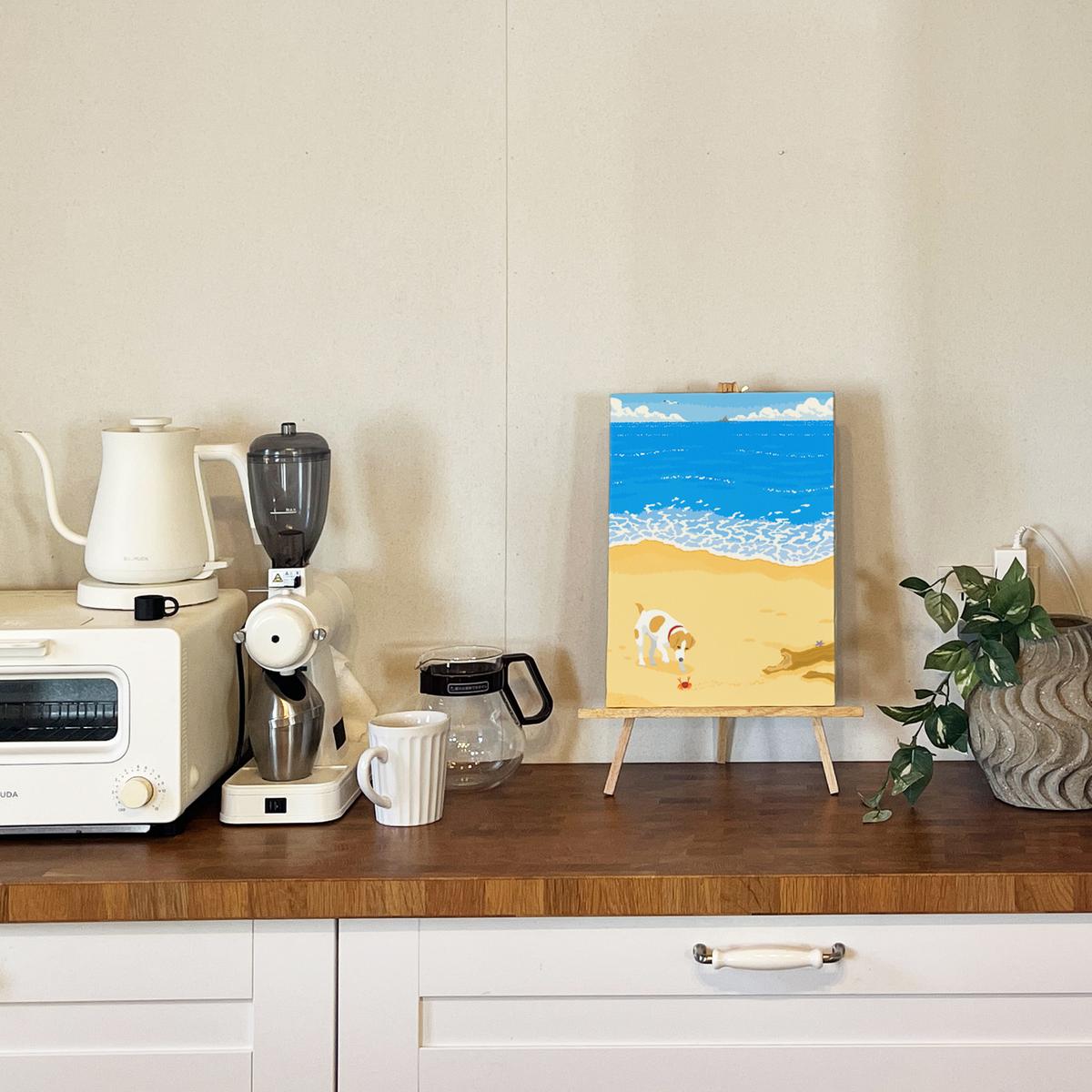 - 湘南・茅ヶ崎で描く、海を感じるイラストアート 『 湘南ランドスケープ04:渚の遭遇 』 キャンバスアートパネル(中) /絵画 風景 犬 猫