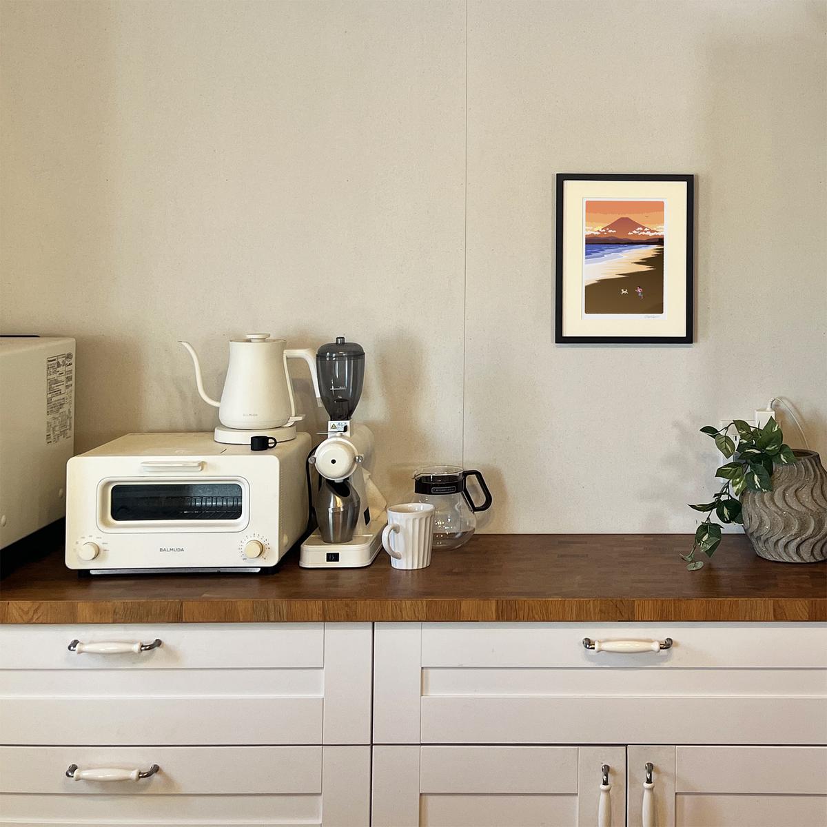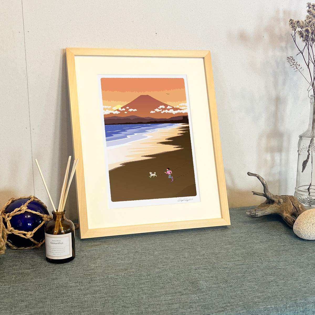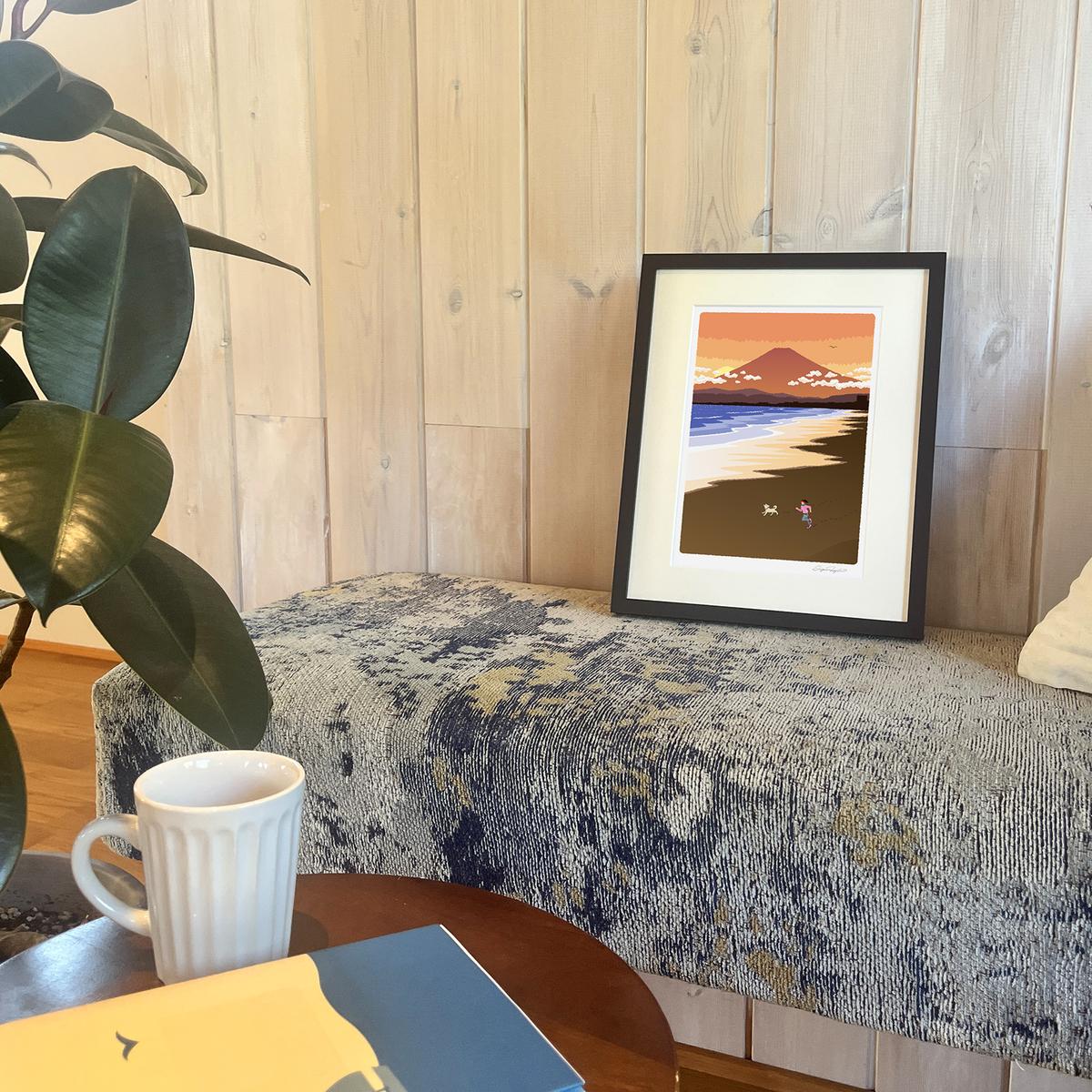 - 湘南・茅ヶ崎で描く、海を感じるイラストアート 『 湘南ランドスケープ11:湘南の富士と夕焼けの軌跡 』 ジークレーアートフレーム (小) /絵画 風景 版画