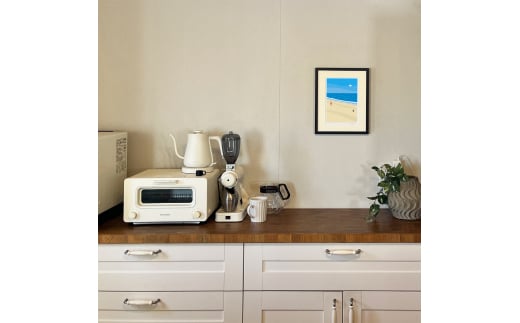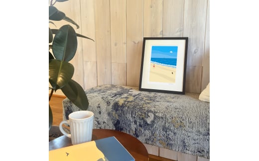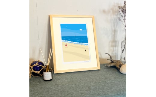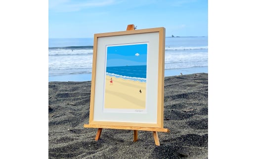 - 湘南・茅ヶ崎で描く、海を感じるイラストアート 『 湘南ランドスケープ01:波打ち際のキャッチボール 』 ジークレーアートフレーム (小/木地仕上げ) /絵画 風景 版画