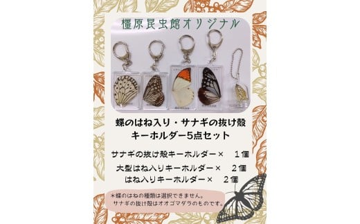 橿原市昆虫館オリジナル 蝶のはね入り・サナギの抜け殻キーホルダー5点セット
