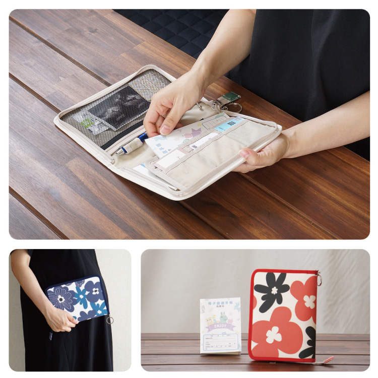 AH128-6 マルチケース (ファスナータイプ) 北欧フラワー Lモデル 1個 クリームカーキ【 母子手帳ケース 2人分 花 かわいい おしゃれ 軽量 Pouche ポーチェ 長崎県 島原市 】