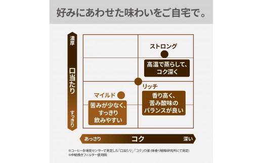 パナソニックのコーヒーメーカーです。豆挽きから抽出、ミルの洗浄まで全自動で行える高機能モデルです。3つの味の濃さコース(リッチ・マイルド・ストロング)に加え、挽き具合の切り替えもでき、合計6種の味のバリエーションを楽しめます。粉からでも豆からでも淹れられ、デカフェコース搭載でカフェインを控えたい時にも対応可能です。