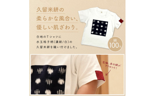 - 風のおくりもの子供Tシャツ・白(サイズ100)_久留米絣 子供 Tシャツ 白 サイズ 100 綿100% 白地 水玉格子柄 濃紺 左袖 赤 絣 アクセント 伝統工芸品 優しい 肌ざわり 衣料品 服 伝統 工芸品 洋服 キッズ 男の子 女の子 風のおくりもの お取り寄せ 福岡県 久留米市 送料無料_Qk011-3