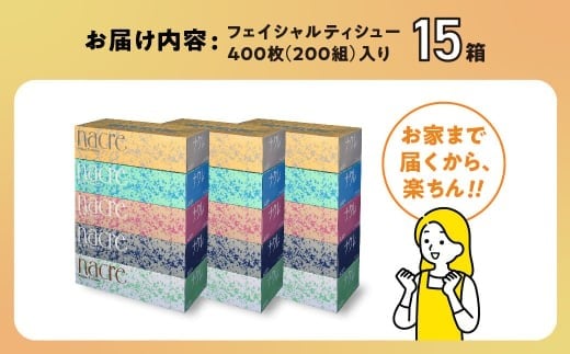 【国産パルプ100%】 ティッシュペーパー 15個 (5箱組×3セット 400枚 200組)ナクレ ボックスティッシュ ティッシュボックス ティッシュ ティシュー BOXティッシュ 箱ティッシュ ペーパー ちり紙 日用品 消耗品 防災 備蓄 東北限定 お試し