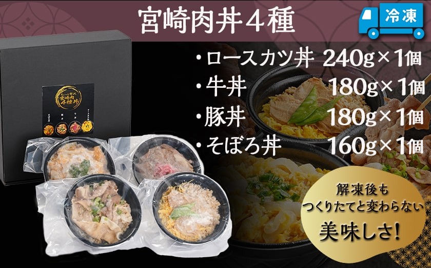 - 宮崎肉丼4種≪ロースかつ丼・牛丼・そぼろ丼・豚丼≫_MJ-F712_(都城市) 丼物 冷凍 牛肉 鶏肉 豚肉 かつ丼 牛丼 そぼろ丼 豚丼 簡単調理 仕送り 手作り 手軽 簡単