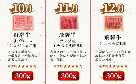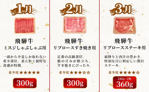 - 飛騨牛 希少部位 定期便 全6回 計1.86kg 2人前相当 すき焼き しゃぶしゃぶ ステーキ 焼肉 BBQ リブロース ランプ イチボ とも三角 ミスジ リブロースステーキ 贅沢 贈り物 6ヶ月 定期 おすすめ レア 人気 飛騨 ブランド牛 牛肉 肉 肉のひぐち