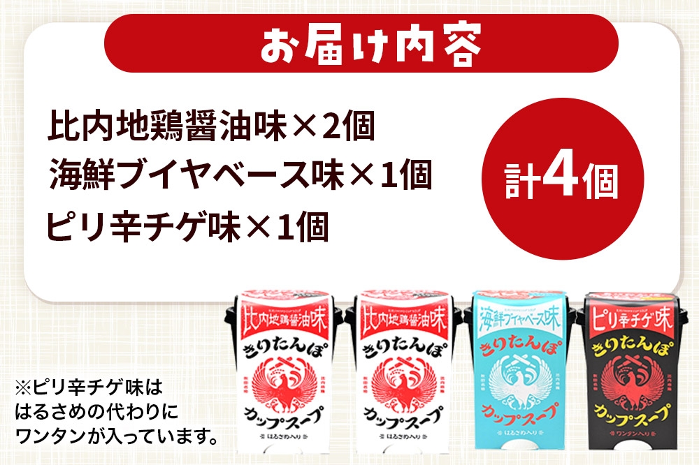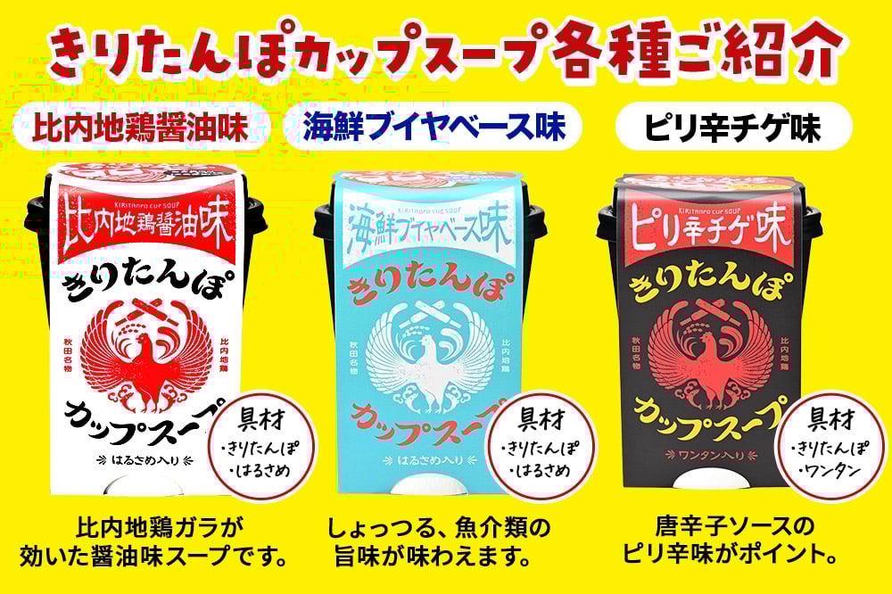 きりたんぽ カップスープ ギフトBOX(比内地鶏醤油味 108g×2、海鮮ブイヤベース味 108g×1、ピリ辛チゲ味 108g×1 計4個入)