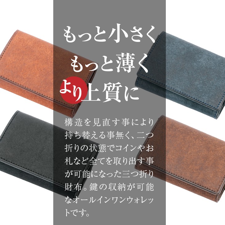 - もっと小さい 三つ折り マネークリップ dritto 3 thin 財布 小さい財布 選べるカラー 全7色 青系/ヌメ/緑系/赤茶/焦茶/紺/黒 専用キーポケット オールインワンウォレット 牛革 レザー [BJ006]