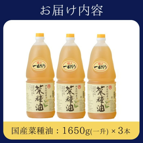 No.007-B <ペットボトルタイプ>国産菜種油(1升×3本) 国産 九州 鹿児島 油 なたね油 調味油 オイル 卓上 菜種 一番搾り 揚げ油 炒め油 ドレッシング【伊集院物産】