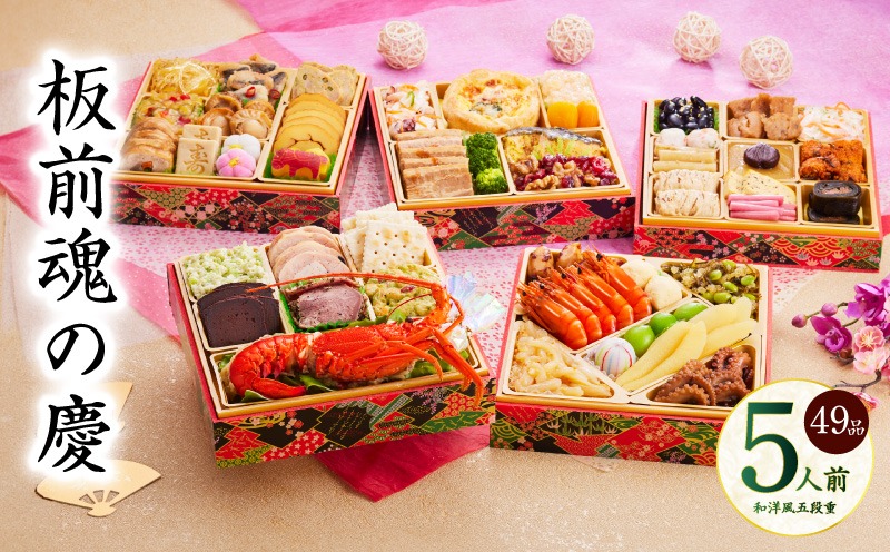 - Y108 おせち「板前魂の慶」和洋風 五段重 49品 5人前 6.8寸 【おせち料理 板前魂 贅沢おせち お節 惣菜 冷凍 先行予約 年内発送 おせち料理2026】