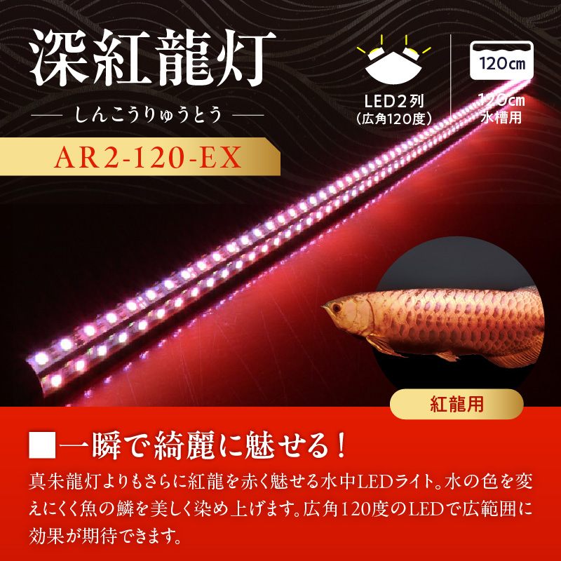 紅龍オーナー必見!一瞬でアロワナを美しく魅せる水中LEDライト|AR2-120-EX[172C20]紅龍 専用 スーパーレッド 赤 照射 水中 アロワナ 水槽ライト テンニングライト LED ライト 照明 水中照明 光 綺麗 強化ガラス 耐久性 吸盤 1年保証 簡単 設置 でんらい インテリア 雑貨 愛知県 小牧市 送料無料