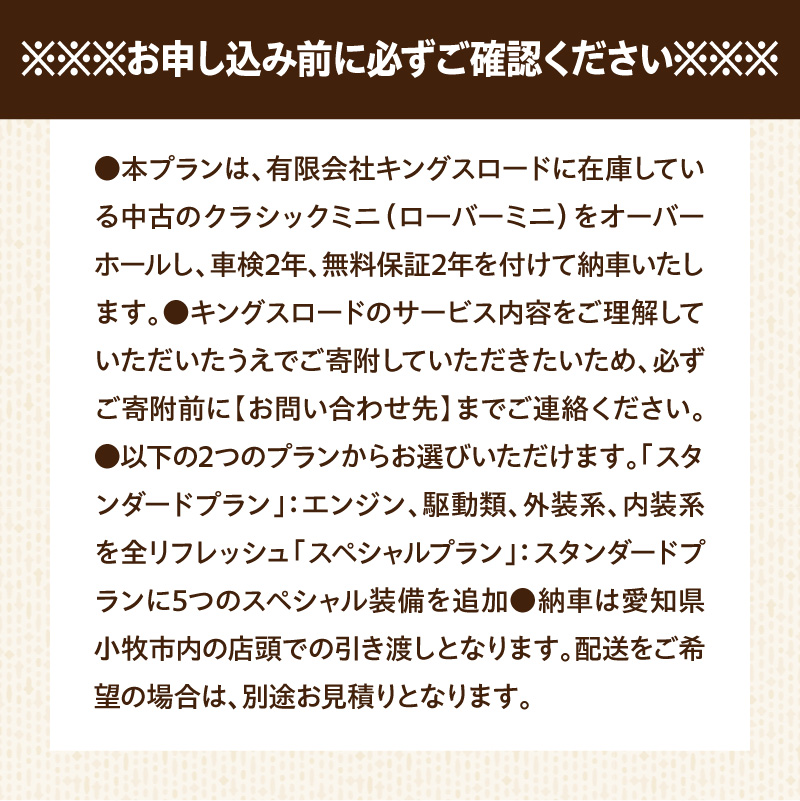 - ローバーミニ専門店 中古車両を全リフレッシュ(エンジン、駆動類、外装系、内装系)して納車する「クラシックミニ スペシャルプラン」チケット[188K02]