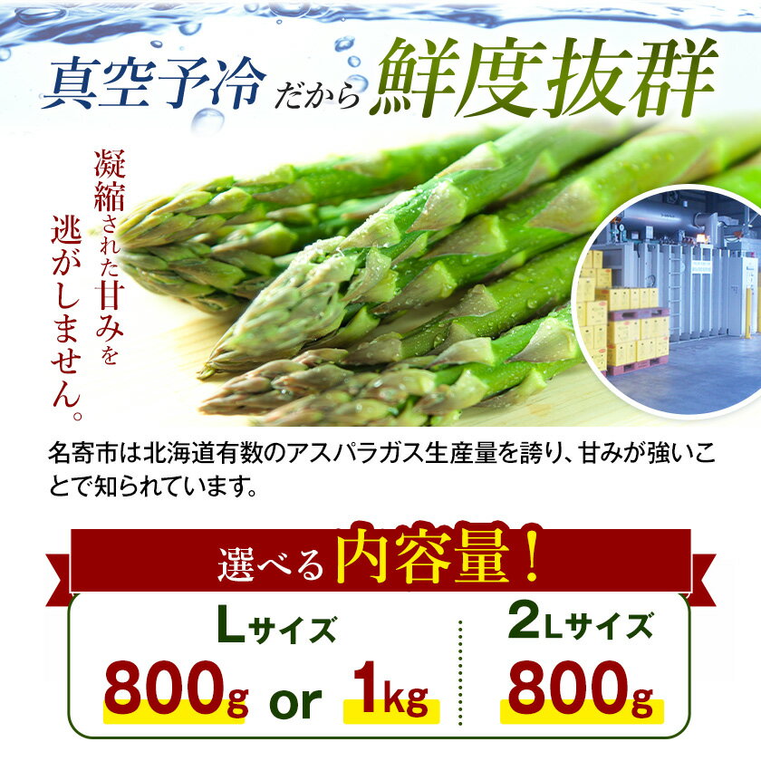 - 【ふるさと納税】朝採りアスパラガス 選べる Lサイズ(800g) または Lサイズ(1kg) または 2Lサイズ(800g) 《2026年5月中旬-5月下旬頃出荷予定》北海道 名寄市 送料無料 朝採り 新鮮 アスパラ