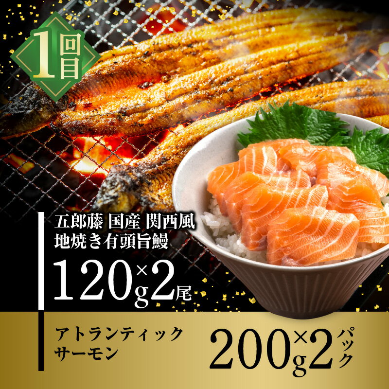 - 【ふるさと納税】毎月うなぎが食べれる! 食べ比べ 定期便 全3回 うなぎ 蒲焼き 粉山椒 サーモン 牛丼の素 いくら 醤油漬け 毎月配送コース 地焼き 有頭鰻 アトランティックサーモン お取り寄せ お取り寄せグルメ 冷凍 大阪府 泉佐野市 送料無料