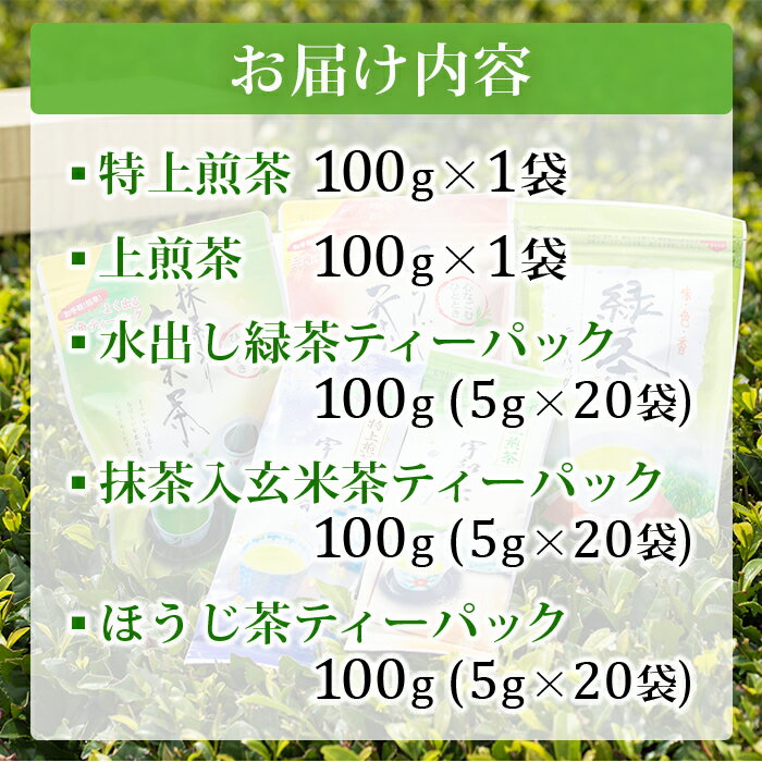 - 【ふるさと納税】<お茶の詰め合わせセット> 茶葉 リーフ 日本茶 お茶っぱ 緑茶 抹茶入り 玄米茶 ほうじ茶 特上 煎茶 水出し ティーパック ティーバック お茶の葉 飲み比べ 飲料 国産 バラエティー 特産品 明芳園 愛媛県 西予市 【常温】『1か月以内に順次出荷予定』