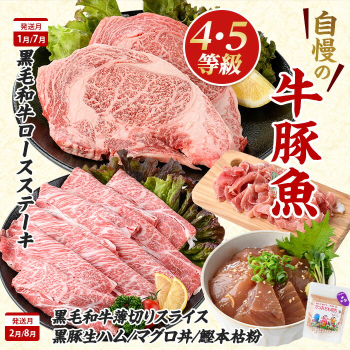 - 【ふるさと納税】<定期便・全6回(連続)>【総重量5kg越え】4・5等級黒毛和牛・黒豚・マグロ丼・カツオ丼・カツオのたたき・すり身定期便【水迫畜産】豚肉 牛肉 生ハム すき焼き 和牛 スライス 焼肉 ロース 黒豚 鍋 小分け ステーキ 焼き肉 かつお 指宿 鹿児島 いぶすき