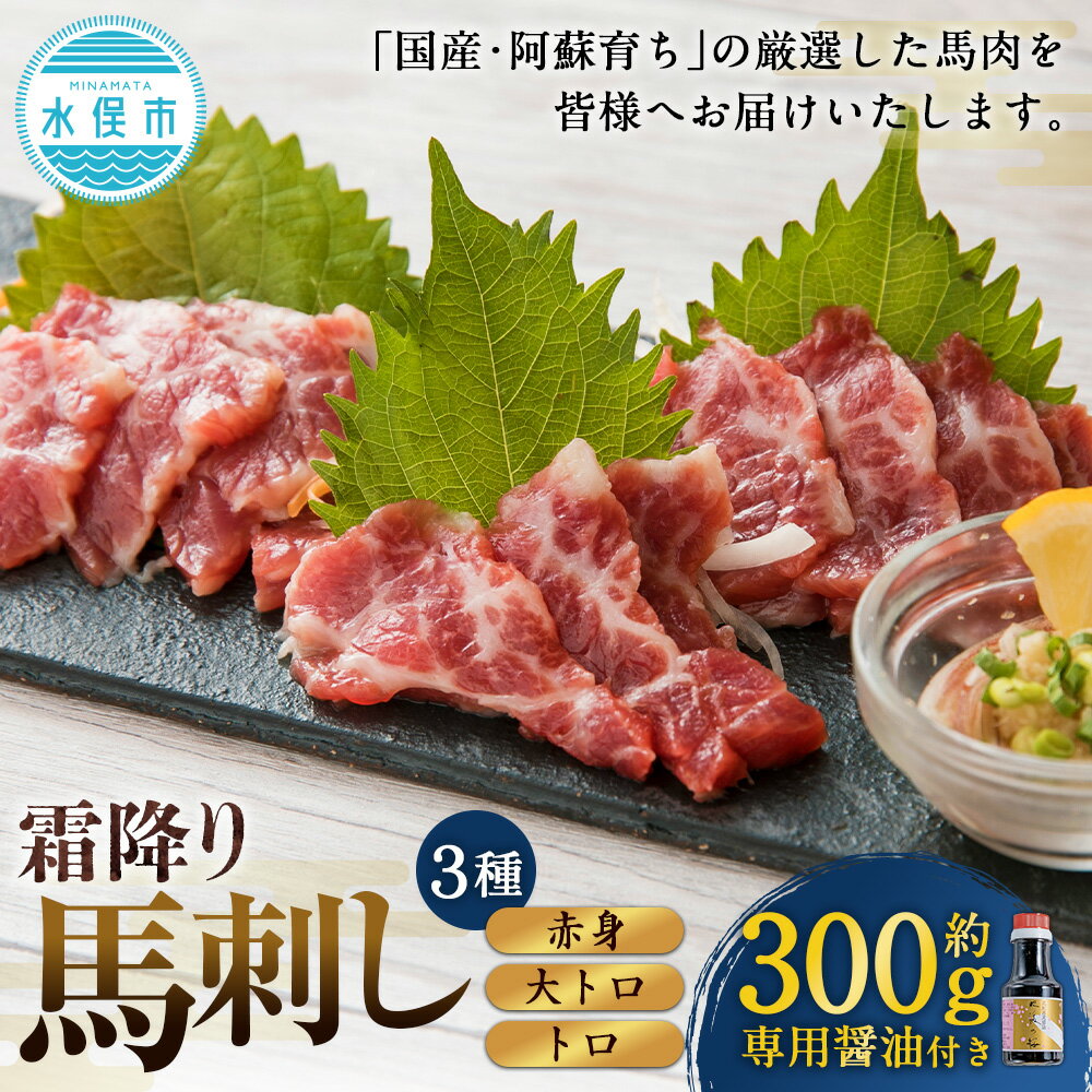 【ふるさと納税】【阿蘇牧場】阿蘇馬 馬刺し 3種 霜降り入(赤身・大トロ・トロ) 約300g 専用醤油付き(150ml×1本) 馬刺 馬肉 馬 霜降り お肉 肉 専用醬油 冷凍 熊本県 水俣市 送料無料