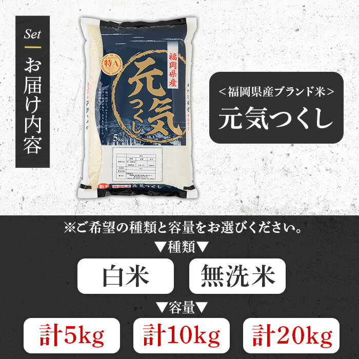 - 【ふるさと納税】<容量選べる>福岡県産ブランド米 元気つくし(5kg~20kg) 白米 無洗米 米 お米 おこめ ごはん げんきつくし ご飯 常温 福岡県産 ブランド米 常温 常温保存 5kg 10kg 20kg おにぎり おむすび お弁当 ライス【朝ごはん本舗】