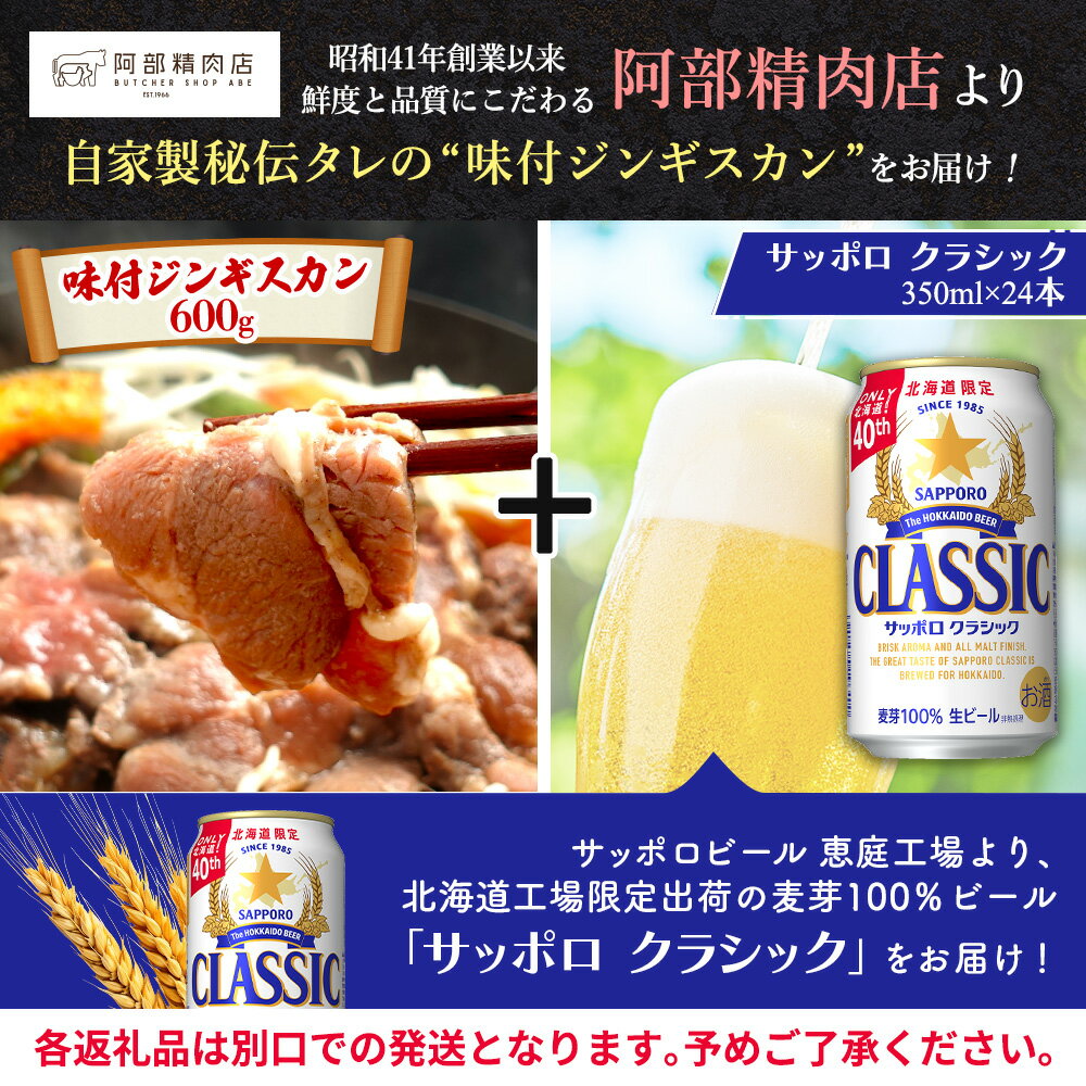 - 【ふるさと納税】阿部精肉店 味付きジンギスカン 600g サッポロクラシック 350ml 24本 コラボ 返礼品 ラム肉 味付き 羊 羊肉 ジンギスカン サッポロビール クラシック ビール 生ビール ふるさと納税 北海道 恵庭市 恵庭【C99001】