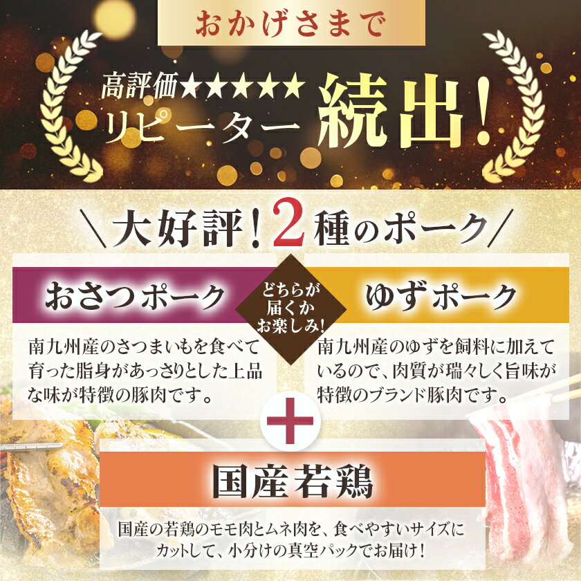 - 【ふるさと納税】【お届け間隔が選べる!】「おさつポーク又はゆずポーク」&鶏バラエティ定期便 - 豚肉 おさつポーク ゆずポーク 国産若鶏 鶏肉 冷凍 毎月3回/隔月3回/毎月6回/隔月6回/毎月12回 送料無料 SKUT-1407 【宮崎県都城市は2年連続ふるさと納税日本一!】