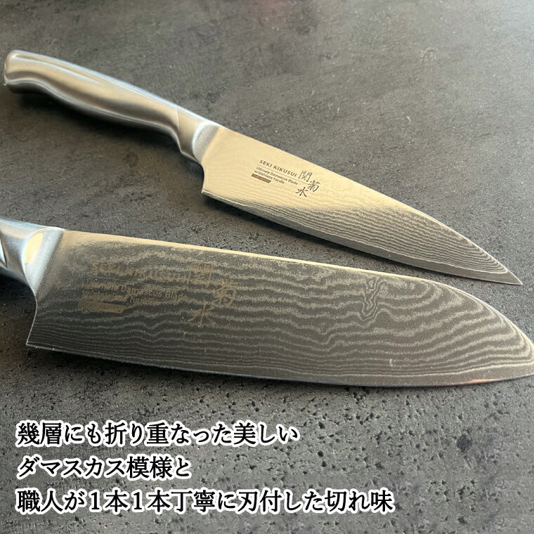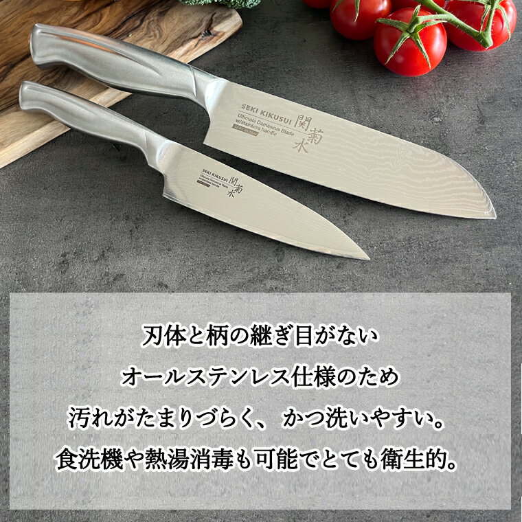 - 【ふるさと納税】関菊水作 ステンレス ダマスカス 2本セット (三徳包丁 170mm ペティナイフ 135mm) (SK-611) 日本製 国産 オールステンレス 一体型 三徳 包丁 万能包丁 ナイフ 果物 食洗機対応 熱湯消毒 よく切れる 耐久性 錆びにくい くっつきにくい 化粧箱 関市 H50-15