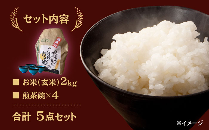 【令和7年産】 玄米 コシヒカリ 特別栽培米 (2kg)+ 【美濃焼】 青輝貫入 煎茶碗 (4個) 多治見市 / 山松加藤松治郎商店 [TEU062]