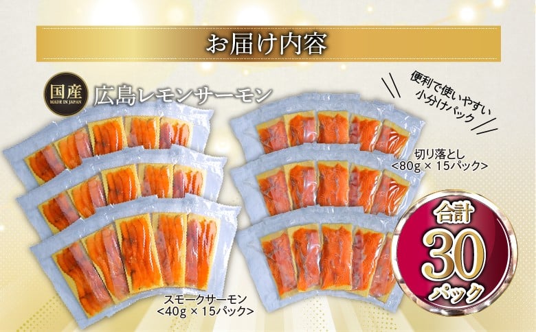 - 国産サーモン 詰め合わせセットG 約1.8kg [切り落とし (80g×15P)+スモークサーモン (40g×15P)] 小分け 広島レモンサーモン|広島 ふるさと納税 特産品 グルメ 国産 サーモン レモンサーモン 高級 広島県産 美味しい お取り寄せ ギフト [1967]