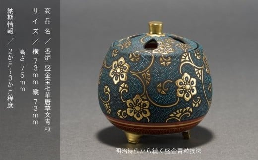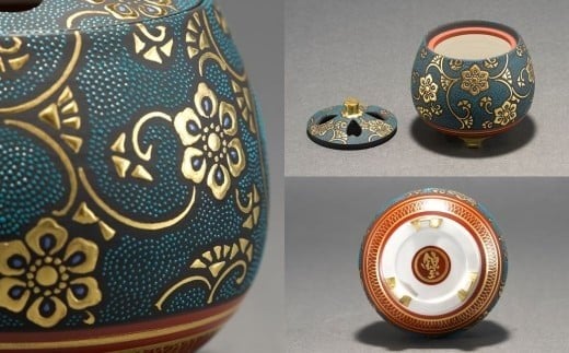 - 九谷焼「香炉 盛金宝相華唐草文青粒」 仲田錦玉