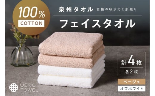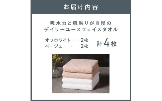 - 【泉州タオル】吸水力と肌触りが自慢のデイリーユースフェイスタオル オフホワイト・ベージュ 4枚【配送不可地域:北海道・沖縄・離島】【039E-101】