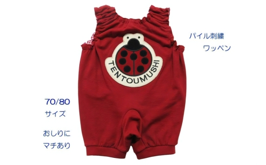TENTOUMUSHI パイルワッペンロンパース・赤・70サイズ|子供 服 赤ちゃん ベビー スナップ 釦 ボタン 肩ひも 綿 国産 日本製 お祝い てんとう虫 [0806]