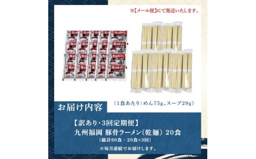 《訳あり・定期便全3回》九州福岡 豚骨ラーメン(総計60食・20食×3回) 豚骨 豚骨ラーメン とんこつラーメン 豚骨 乾麺 かんめん わけあり 訳アリ 業務用 簡易包装 メール便 個包装 小分け 常温 常温保存 長期保存 定期便 頒布会【マル五】as06-097