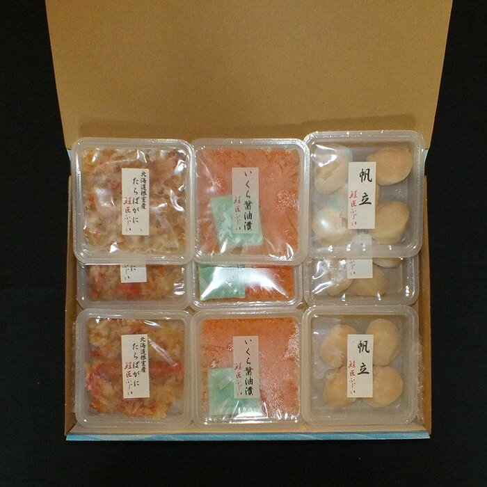 - 【ふるさと納税】 [北海道根室産] いくら醤油漬け 50g × 3P ・ボイルたらばがに剥き身 70g × 3P ・ほたて貝柱 65g × 3P ホタテ ほたて 帆立貝柱 ホタテ貝柱 たらば タラバ タラバガニ たらば蟹 タラバ蟹 かに カニ 蟹 イクラ 醤油漬 北海道 根室市 ふるさと納税 B-42105
