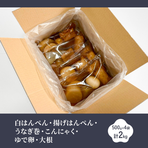 - 浜名湖おでん4袋セット 白はんぺん 揚げはんぺん さつま揚げ うなぎ巻 こんにゃく ゆで卵 大根 500g×4袋 計2kg