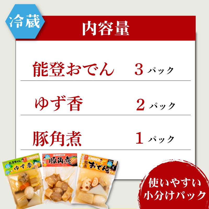 - 惣菜 能登 おでん 豚角煮 6袋 セット パウチ 冷蔵 自慢 人気 特製 おかず 3種 詰め合わせ 簡単 調理 便利 手軽 湯煎 湯せん 温めるだけ 時短 昼食 夕食 晩御飯 一人暮らし もう一品 和食 お惣菜 ご飯 の お供 酒 の あて 酒 の 肴 おつまみ 家飲み 宅飲み 北陸 石川 羽咋 八幡 すしべん [H078]