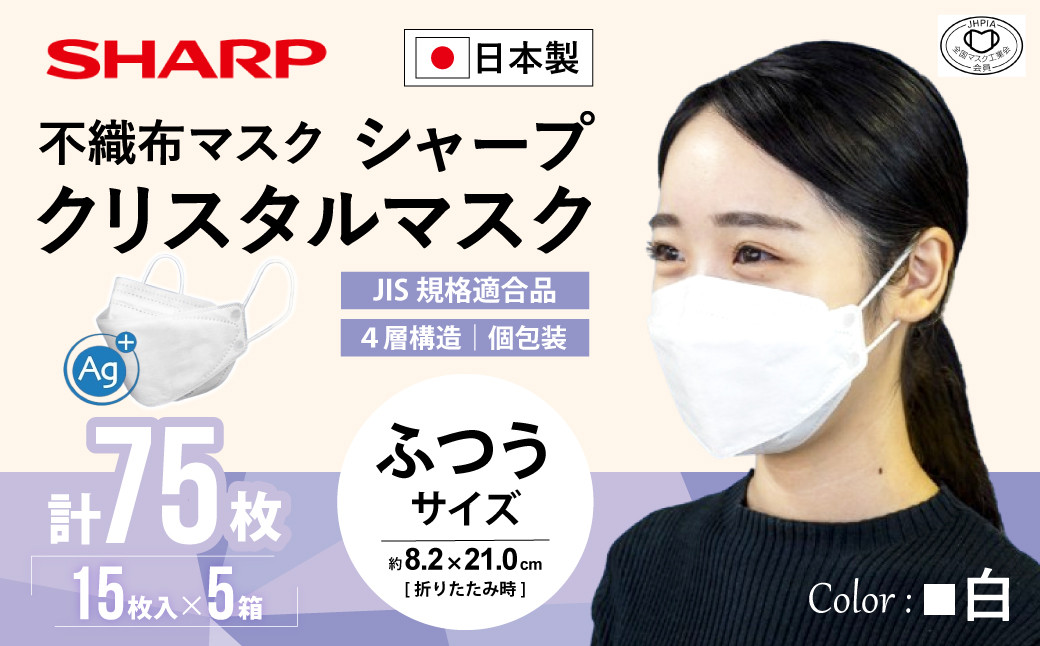 - SH-10 シャープ製不織布マスク「シャープクリスタルマスク」抗菌タイプ 個包装15枚入×5箱