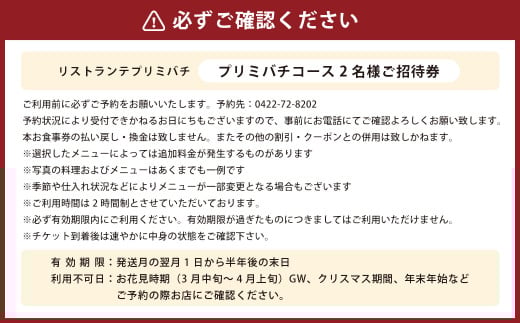- 【リストランテプリミバチ】プリミバチコース 2名様 ご招待券