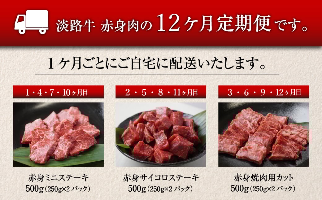 【定期便12ヶ月2026年1月発送~】淡路牛 赤身肉の定期便(赤身ミニステーキ・赤身サイコロステーキ・赤身焼肉用カット)