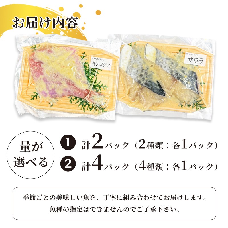 - 西京味噌漬けセット 2パック/4パック (2~5切れ/パック)| 漬け魚 アソート ランダム エテカレイ シルバー さば 金目鯛 甘鯛 真鯛 ぶり 鰆 銀ダラ 自家製 西京味噌 味付き 焼くだけ 簡単調理 冷凍 小分け 個包装 京都 舞鶴