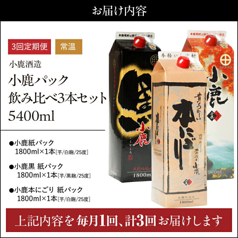 【ふるさと納税】【定期便全3回】小鹿パック飲み比べ3本セット(小鹿 1,800ml(芋・白麹・25度)×1、小鹿本にごり 1,800ml(芋・白麹・25度)×1、小鹿黒 1,800ml(芋・黒麹・25度)×1)5,400ml×3回 飲み比べ! 芋焼酎 芋 いも 焼酎 酒 飲み比べ【小鹿酒造(株)】