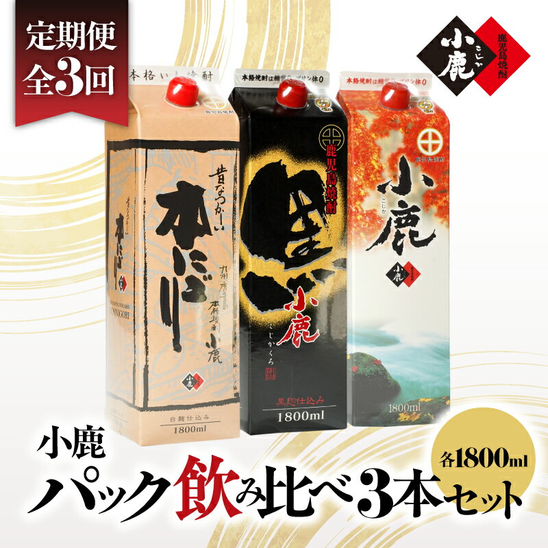 - 【ふるさと納税】【定期便全3回】小鹿パック飲み比べ3本セット(小鹿 1,800ml(芋・白麹・25度)×1、小鹿本にごり 1,800ml(芋・白麹・25度)×1、小鹿黒 1,800ml(芋・黒麹・25度)×1)5,400ml×3回 飲み比べ! 芋焼酎 芋 いも 焼酎 酒 飲み比べ【小鹿酒造(株)】