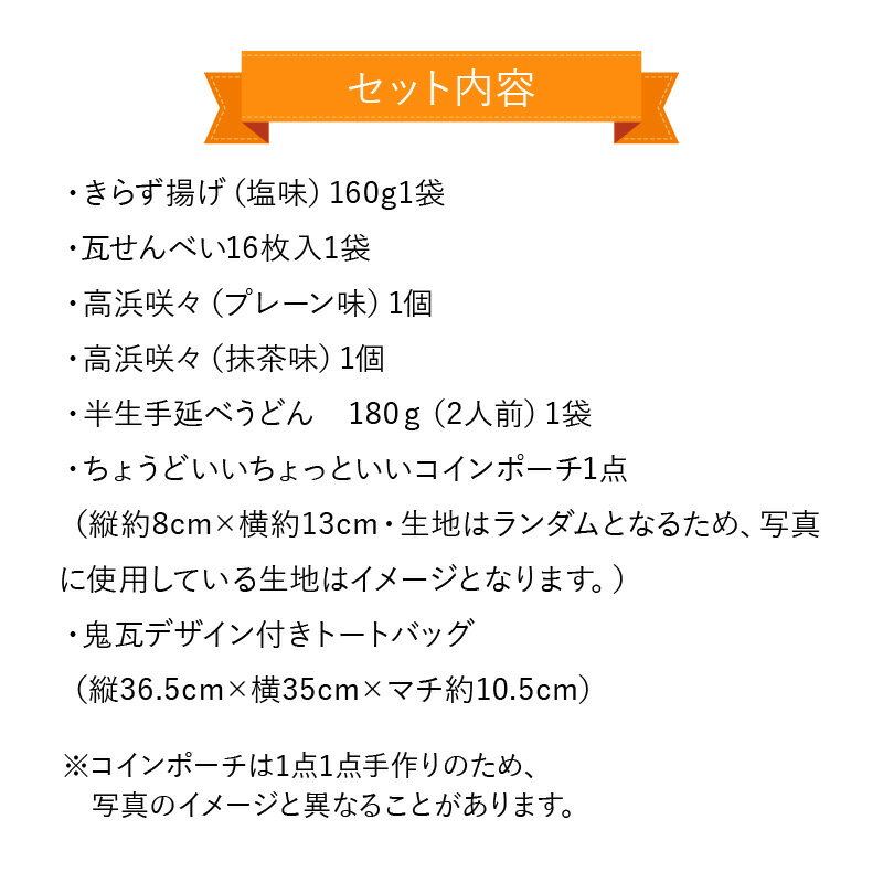 【ふるさと納税】高浜高校SBP【セレクトギフト】ソ-シャル・ビジネス・プロジェクト きらず揚げ 瓦せんべい 高浜咲々 半生手延べうどん コインポーチ トートバッグ 詰合せ ギフト 贈り物 高浜市 特産品 地元密着 送料無料