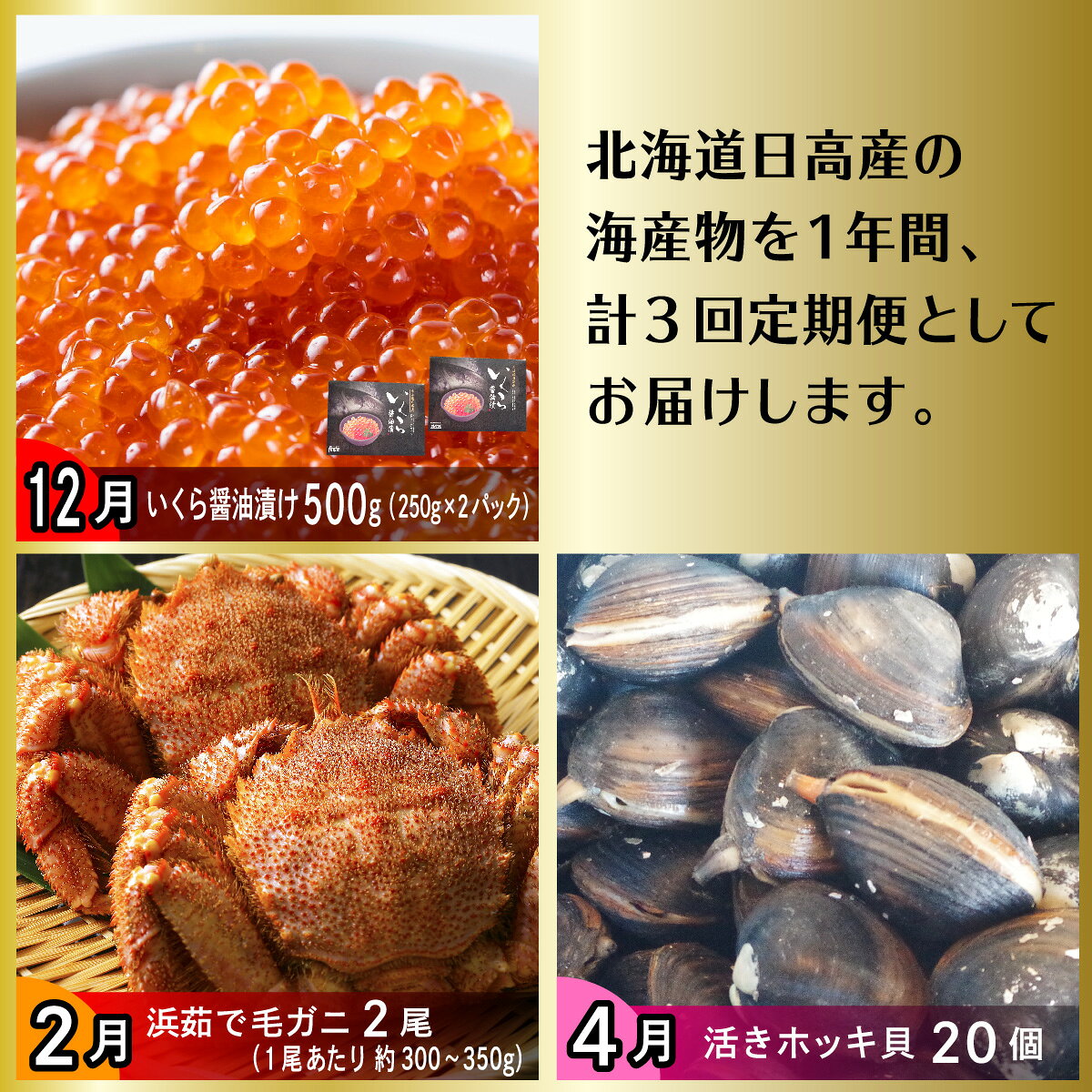 【ふるさと納税】 < 定期便 3回 > 北海道産 海の幸 毛ガニ いくら ホッキ かに カニ 毛蟹 蟹 北寄 貝 イクラ 鮭卵 魚卵 旬 魚貝 魚介 海鮮 海産物 冷蔵 冷凍 北海道 新ひだか町 < 予約受付 >
