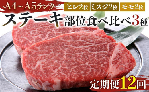- 【定期便全12回】博多和牛【A4~A5】ステーキ部位食べ比べ3種(ヒレ150g×2枚、ミスジ100g×2枚、モモ100g×2枚)計700g