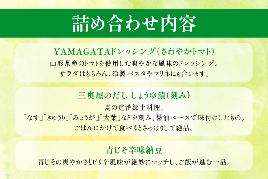 - 夏 限定 詰め合わせ 7点 セット [高畠町観光協会 山形県 高畠町 tk06ays670007] だし 山形のだし ドレッシング トマト 青じそ 納豆 つゆ 調味料 こんにゃく 玉こん カレー カルビ 牛すじ 牛スジ 山形 食べ比べ 期間限定